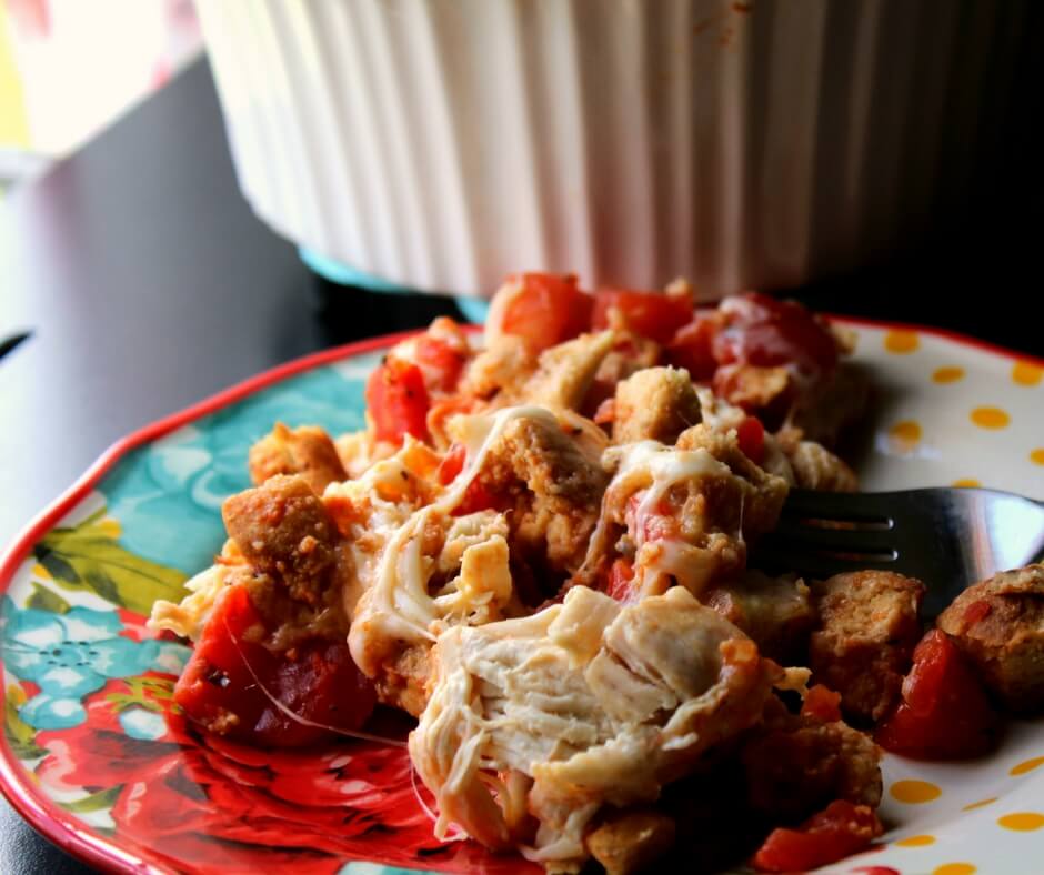 - Place thawed chicken in a 13 x 9 or a 1½ quart casserole dish that has been sprayed with coconut oil cooking spray. Sprinkle with cheese (reserve a couple tablespoons for topping) and then sprinkle Italian seasoning over the cheese. Top with bread cube and tomato mixture and remaining cheese.