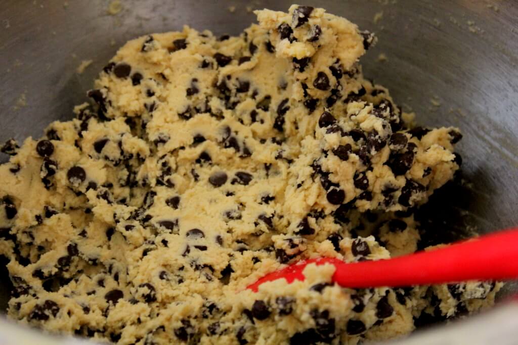 - Slowly combine dry ingredients with wet, beating on low speed with a hand mixer until a soft dough forms. Stir in chocolate chips and walnuts.