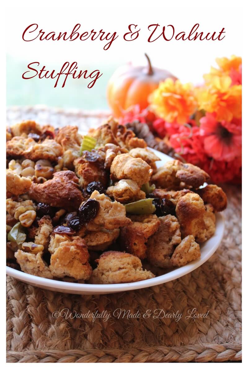 Last year I shared this recipe for Healthy Baked Stuffing. This cranberry walnut stuffing is variation of that recipe. My children are grown so these recipes feed about four to six people. I’ve been known to bake both of these as stuffing balls and use them as “dumplings” in my Dressed Up Turkey Soup.