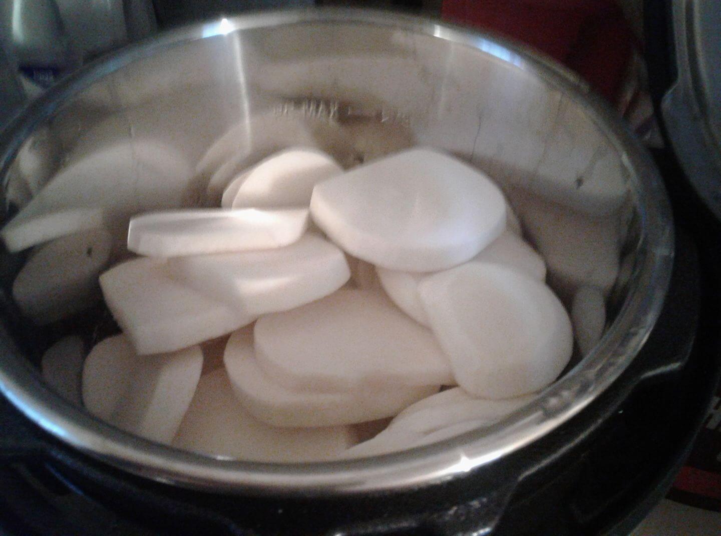 I wash and peel my turnips. We then slice or dice them. I place the slices into the liner of my pot or on a steamer basket.