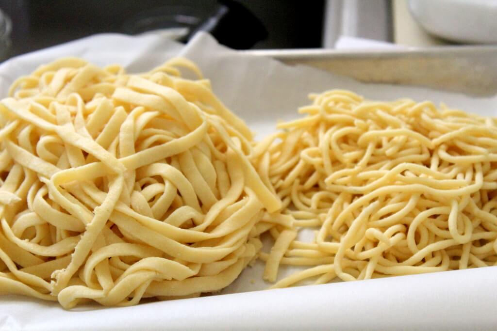 - Press Pasta through an extruder or roll and cut noodles
