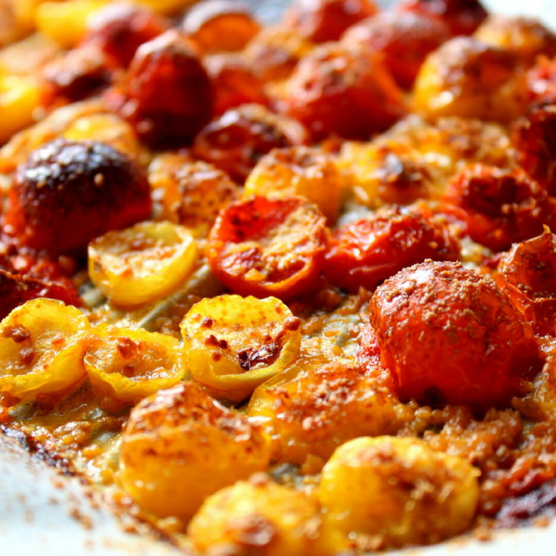 Roasting them makes them just a bit on the chewy side which helps to get your digestive juices flowing. Roasted Parmesan tomatoes are a bit higher in carbs as the roasting process does eliminate much of the water content.