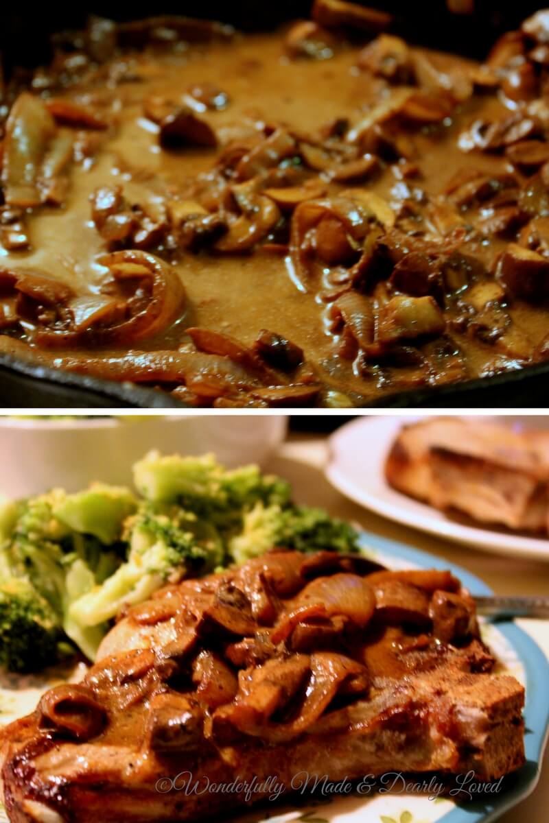 I have made pork chops like these smothered and covered with pan gravy since my boys were little. Mind you one of my boys doesn’t eat gravy ever, so for him he’d just grab the chop and his favorite vegetables, because I was lucky enough that they all liked vegetables. I would make these in the oven during that time in my life.